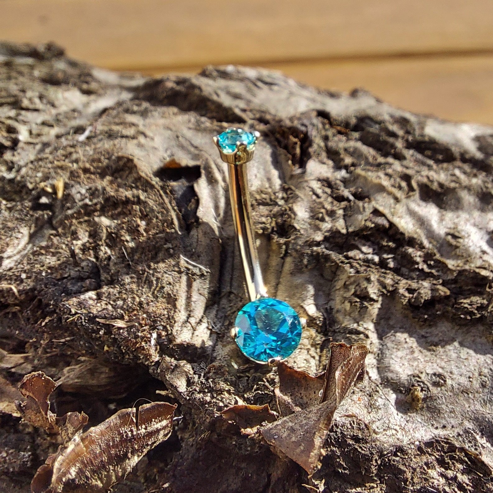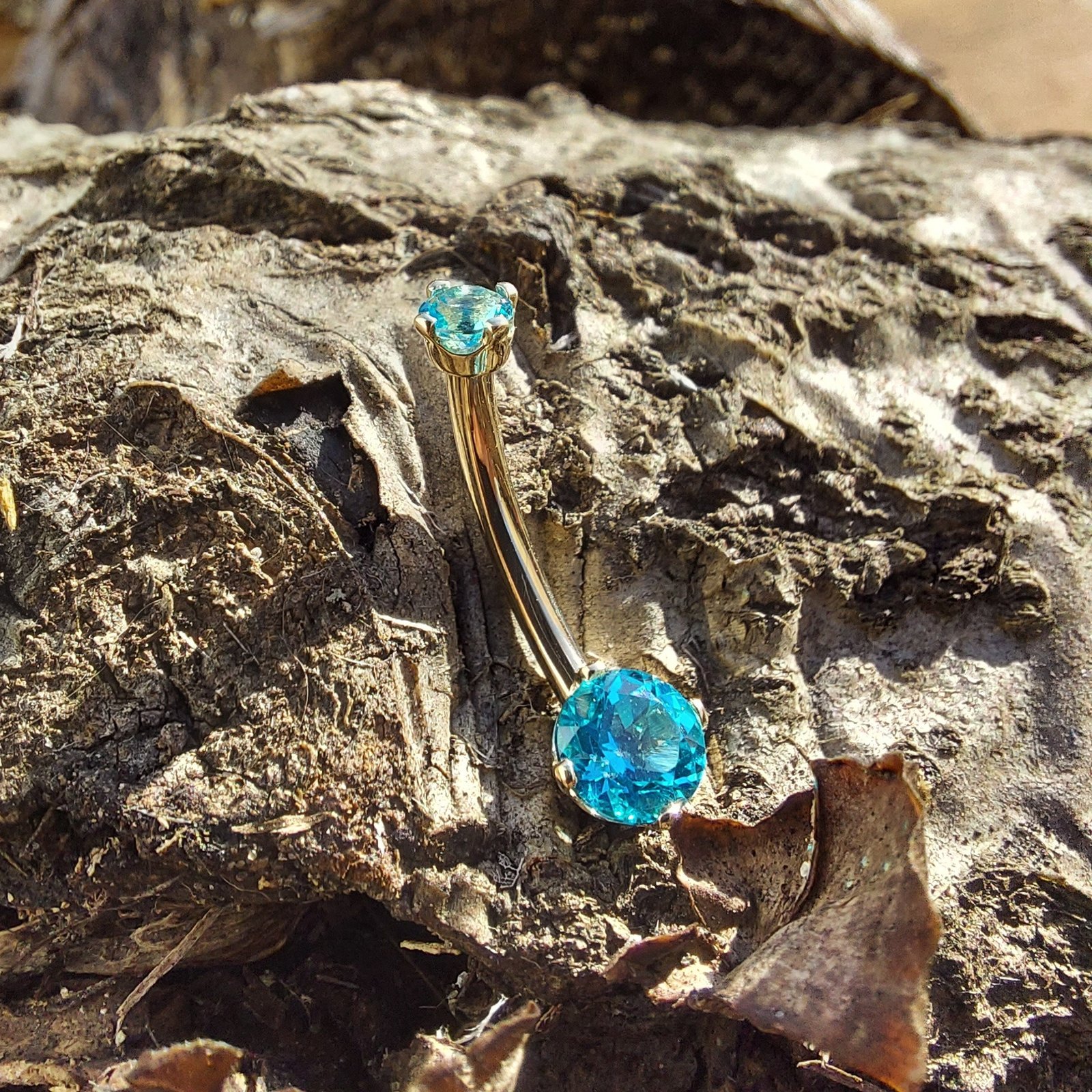 BVLA Classic Prong with a 3mm top and 5mm Bottom Prong Jeweled Navel Curve 14k Yellow Gold 14g 7/16" with Paraibia Topaz.