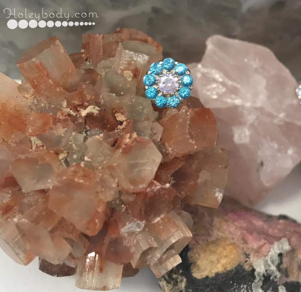 Anatometal's Miro threadless end comes you in Solid 18k White Gold 6mm at widest point, 1.5mm tall with Center 2mm, Around 1.25mm x 8 stones in Aurora Borealis center with Mint Green Crystals.Piece can be special ordered in:* any color gemstones*any color gold
