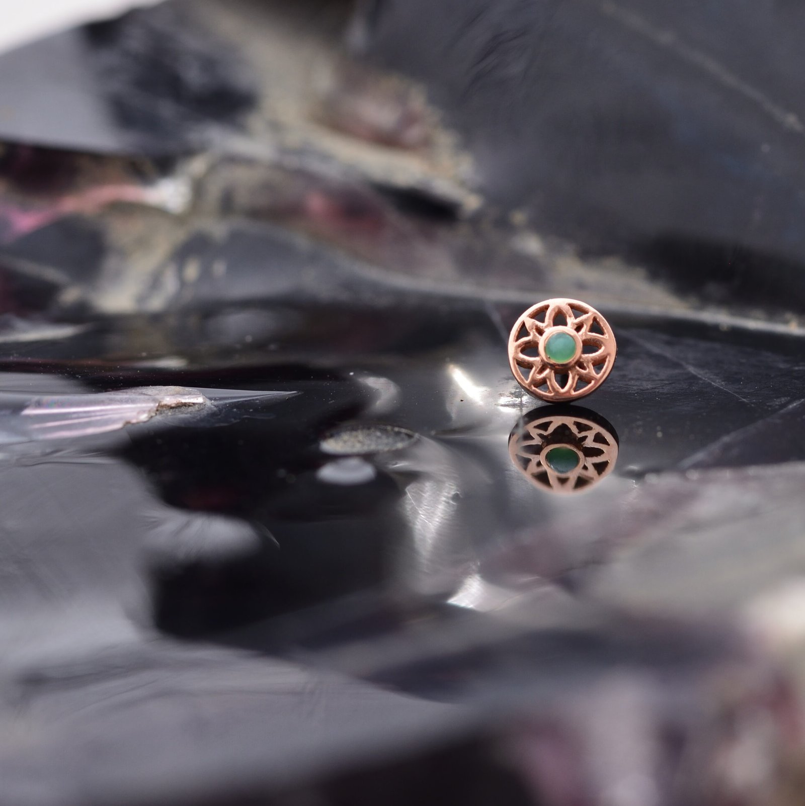 This BVLA Threadless Paloma Flower Solid 14k Rose Gold houses a 1.5mm Chrysoprase set within it's 5mm diameter.