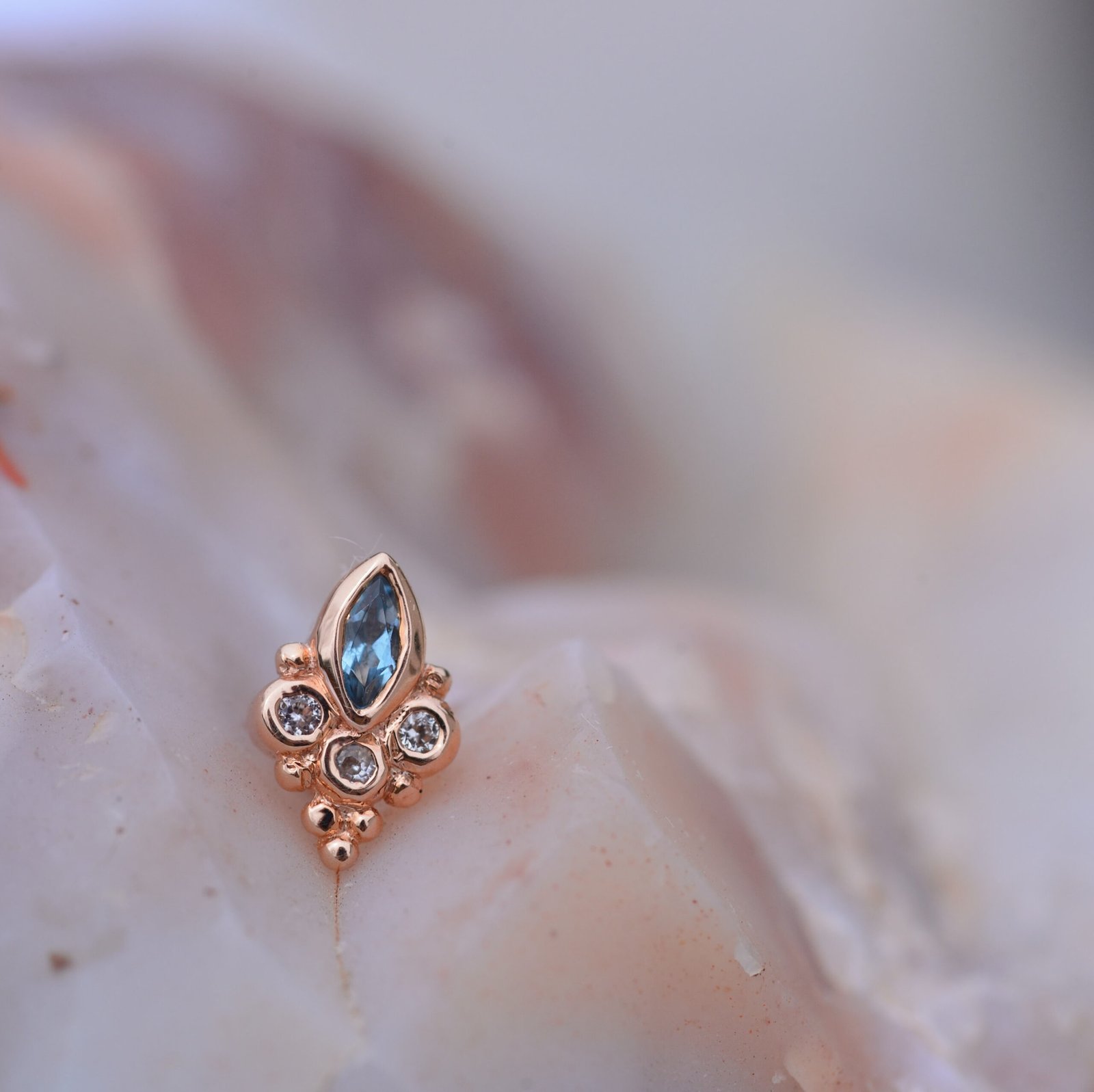 Threadless 14K Solid Rose Gold end with Swiss Blue Topaz Marquise with White Sapphire accents.