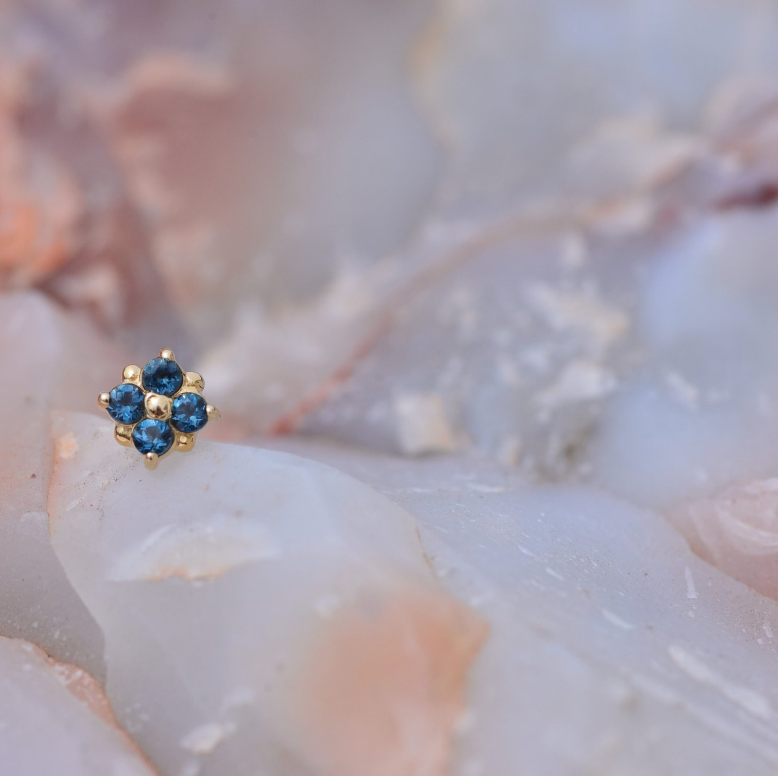 Threadless Reema in solid 14k Yellow gold with - (4) 1.5mm AA London Blue Topaz gemstones